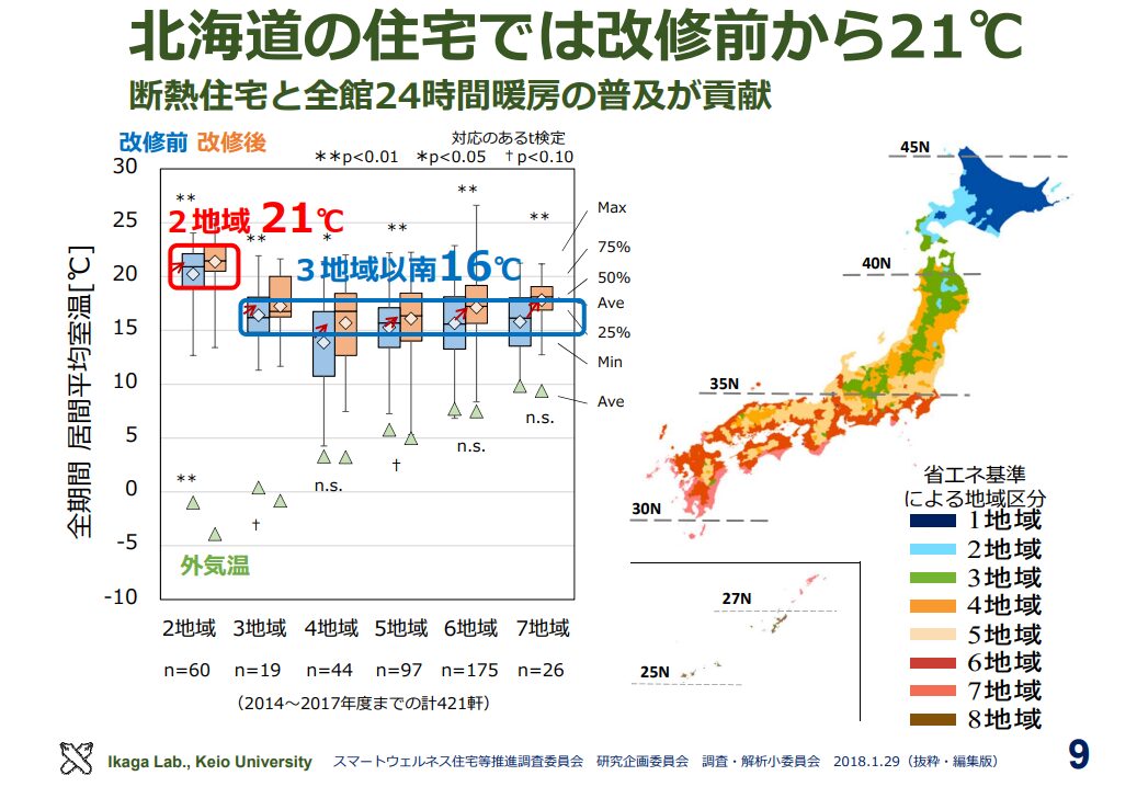 興味深いのは、年間平均の室内温度を見ると、北海道が全国で最も高いことです。これは断熱水準の違いが生活環境に大きく影響している結果だと考えられます。